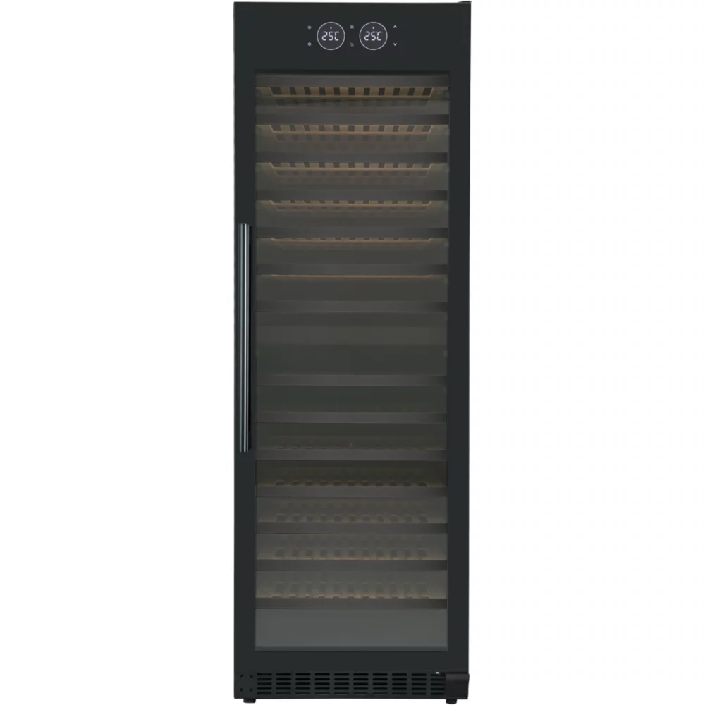 - Type de porte : vitrée, permet de visualiser facilement les bouteilles sans avoir à ouvrir la porte, ce qui réduit la circulation de l’air dans la cave et donc la variation de la température. Le traitement anti-uv protège le contenu.